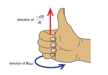 Pointing the thumb of your right hand in the direction of [math]\displaystyle{ \frac{-dB}{dt} }[/math] allows you to curl your fingers in the direction of [math]\displaystyle{ \mathbf{E_{NC}} }[/math].