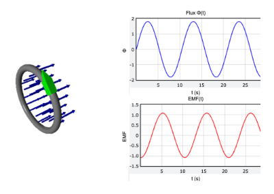 To help visualize how a time-varying magnetic field induces an emf, here is a fully interactive GlowScript simulation. The model shows a loop of wire with a magnetic field that oscillates in time, producing a changing magnetic flux. According to Faraday’s law, this changing flux induces a non-Coulomb electric field which drives a circulating current in the loop.