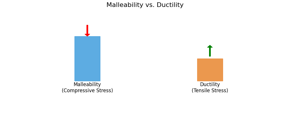 It is important to keep in mind that malleability is not the same as ductility. These two physical properties of metals, although similar, have a few distinct differences. Ductility is the ability of a material to stretch under tensile stress, a force acting away from the object. Malleability, on the other hand, is a metal's ability to deform under compressive stress, a force acting towards the center of the object. The key difference here, is tensile versus compressive stress. Some exceptional materials, such as copper, have both good ductility and good malleability.