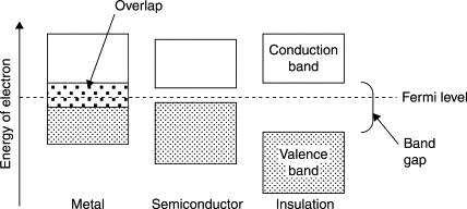 Band gaps of a metal (conductor) overlapping vs. the small band gap of a semiconductor and the large band gap of an insulator.