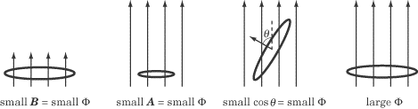 The magnitude of the magnetic flux depends on the strength of the magnetic field, the size of the surface area, and the angle between the direction in which the surface area points and the direction of the magnetic field.