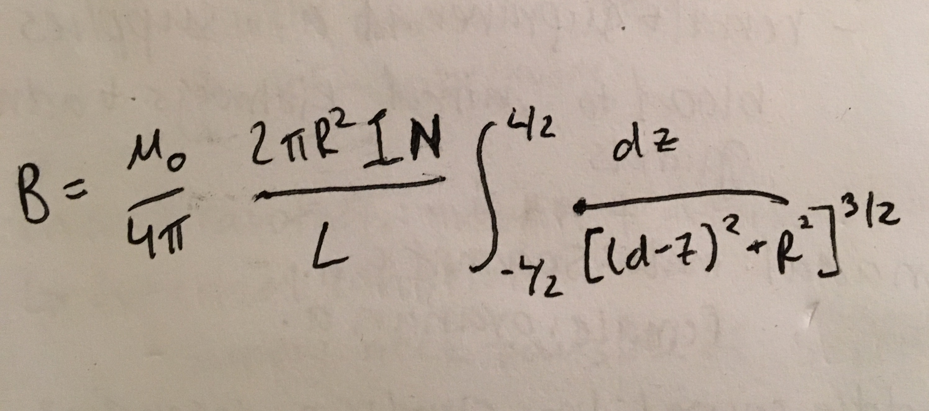 The origin of the solenoid is at its center. To find the location of one piece we have to find the integration variable, which is x, and then the distance from the loop to the observation location is d-z. There are also N/L loops in the | The origin of the solenoid is at its center. To find the location of one piece we have to find the integration variable, which is x, and then the distance from the loop to the observation location is d-z. There are also N/L loops in the solenoid so the number of loops in the length <math>\Delta x</math> is N/L*<math>\Delta E</math>. | ||