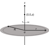 Say we have a flat circular disk with radius [math]\displaystyle{ R }[/math] and carrying a uniform surface charge density [math]\displaystyle{ \sigma }[/math]. It rotates with an angular velocity [math]\displaystyle{ \omega }[/math] about the z-axis.