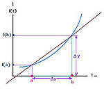 Below is a visualization of the analytical prediction of the average velocity. As you can see, it takes two points, (a, f(a)) and (b, f(b)), and finds the average between the two points. Also depicted in the image is the incapability to model non-linear curves by comparing the average slope (velocity) compared to the actual slope (velocity). | |||