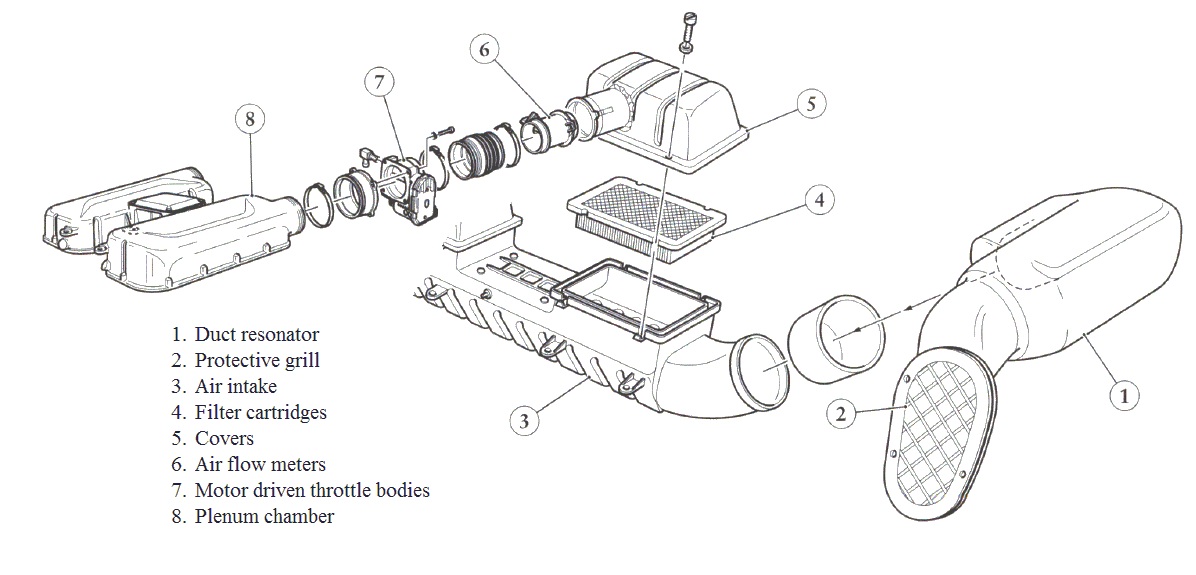 Air is pulled into the engine from the environment by the air intake and stored in the plenum. From the plenum, air enters the intake manifold where fuel injectors will distribute the proper ratio of fuel to the amount of air. Naturally aspirated engines (no turbos, superchargers or anything used to force more air into the engine) typically run at a 14:1 air/fuel ratio. The intake manifold is bolted directly onto the engine so that this mixture can enter the combustion chamber or bore. Intake valves during seal the opening to the chamber on the intake side of the engine; during this phase or "stroke" however, they are opened to allow the air-fuel mixture into the bore. Pisons, which travel up and down the bore and connected to the crankshaft (see below), are towards the bottom of the bore during this stroke to allow for the most air to enter the combustion chamber and will reach BDC or bottom dead center.