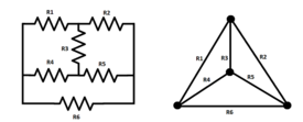 We can describe an electrical circuit as a graph where the nodes represent specific points and the edges represent the components connecting them. E.g: | We can describe an electrical circuit as a graph where the nodes represent specific points and the edges represent the components connecting them. E.g: | ||