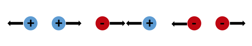 A point charge refers to any particle that has a significantly small radius relative to the distance between it and any observation point of interest. This allows the generalization that all of the particle's charge and mass are localized at a specific point in space. The two known elementary charges are the proton and electron, both of which are modeled as point charges. A single proton holds a charge of +e (1.6e-19C), while an electron holds a charge of -e (-1.6e-19C). Like point charges, such as two positive or two negative charges, repel one another; opposite charges are attracted to one another. This pattern of attraction and repulsion is shown below.