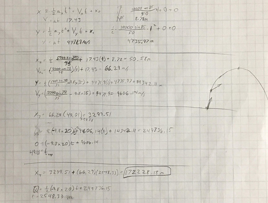 In the example above a staged rocket launches and then ignites its next stage immediately. Once its fuel has been exhausted the rocket follows a free fall trajectory with horizontal motion, or projectile motion. The same basic equations are applied as the previous problems, but you must account for changing angles and multiple forces acting upon the rocket until it becomes true projectile motion.