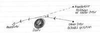 [[File:grtest1.png|200px|thumb|right|An image depicting how light is deflected around massive bodies, causing us to view objects at an 'apparent' position that differs from their actual positon.]]