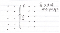 ''Suppose you have a wire with a current ''I=6'' amps. This wire is sitting in a constant magnetic field of magnitude 1 T. This wire has length 6 cm. What is the magnitude and the direction of the force acting upon the wire, according to the diagram? The magnetic field is pointing out of the page.'' | |||