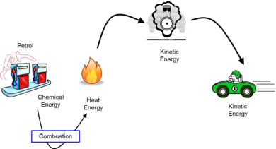 In the figure on the right, there is a candle being burned. When something is burned, the energy stored within the chemical bonds that make of the object are broken and energy is released. In the figure, the chemical of the energy of the candle is being converted into both heat and light. Practically, it would be much more useful if 100% of the chemical energy of the candle was converted to light (the whole point of a candle!). If this were the case, either the candle would burn much brighter, or burn longer, since energy is no longer being wasted as heat. As stated above however, this process is not 100% efficient, and thus, some energy will inevitably will be converted to heat energy.