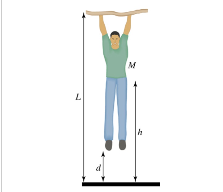A person jumps straight up in the air from a crouching position. Their center of mass moves h, or 2 m. Their total mass, m is equal to 60 kg. Find the velocity of the center of mass of the jumper. When the jumper jumps, the normal force of the ground is equal to 2x the force of gravity.