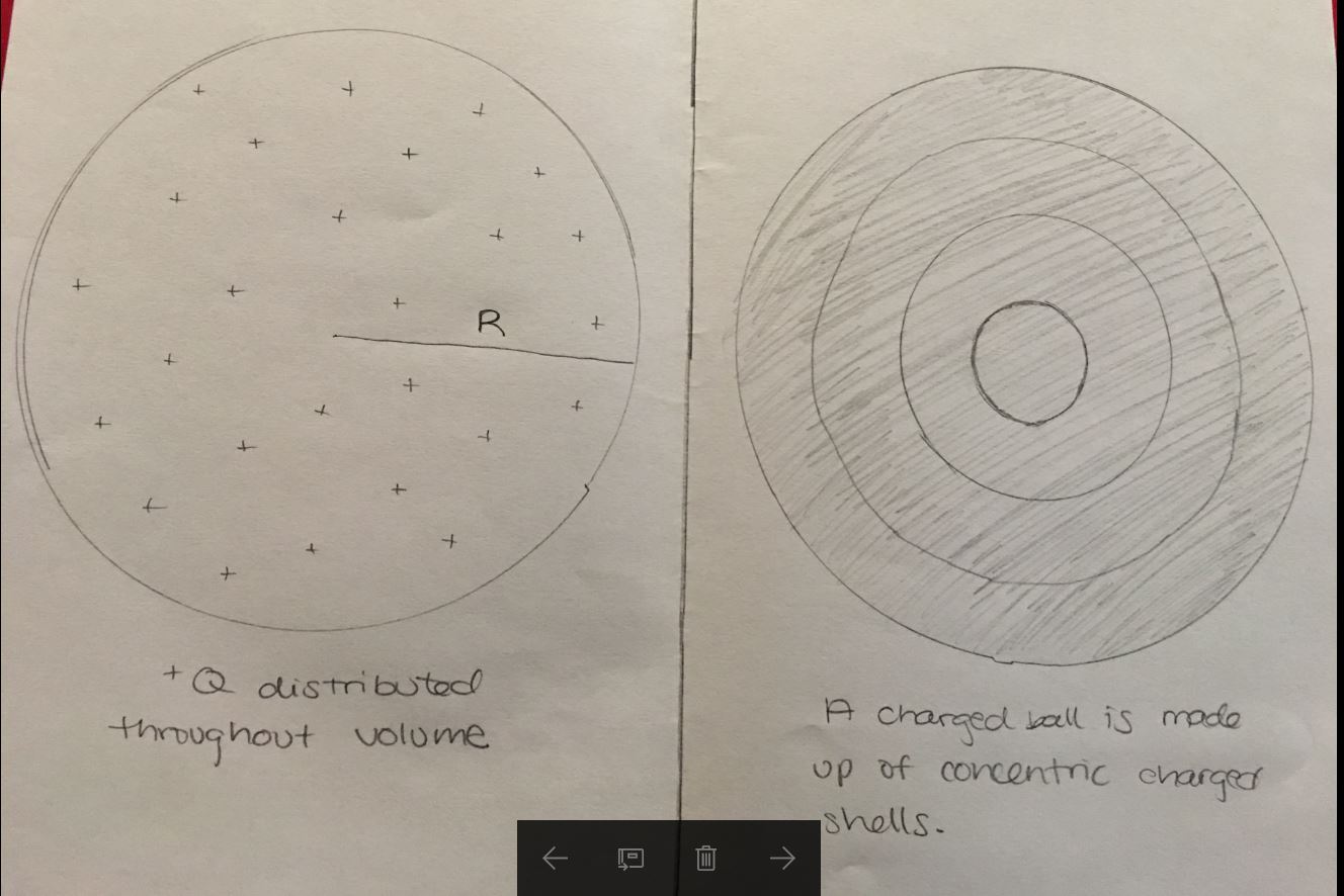 However, when r<R, the observation location is inside of the sphere and the sphere overall must be thought of as infinitely many concentric charged shells inside of each other. All of the shells with a radius larger than that of the observation location do not contribute to the electric field at the observation location. This phenomena is because the electric field produced by these larger shells cancels out at any given point inside of itself. As a result only the shells smaller than the radius of the observation location need to be accounted for. To find [math]\displaystyle{ \vec E_{net} }[/math], add the contributions to the electric field from the inner shells. After adding the contributions of each inner shell, you should have an electric field equal to: