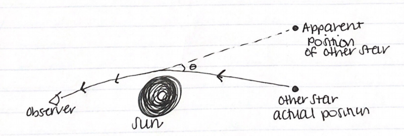 One of the proofs of relativity, the deflection of light around massive bodies can be seen drawn out here. Compare the apparent position with the actual position of the star.