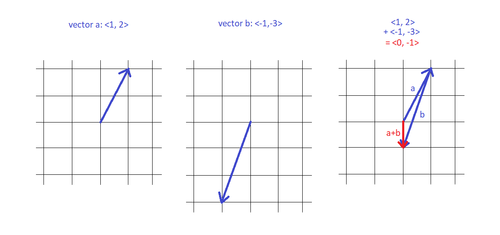 [math]\displaystyle{ \vec{a} + \vec{b} = (a_x + b_x)\hat{i} + (a_y + b_y)\hat{j} + (a_z + b_z)\hat{k} }[/math].