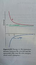 In the next figure to the right it is important to note as the asteroid gets farther away the kinetic energy will continue to fall and K approaches K+U, but K can not be negative since it involves velocity. When the two objects are far apart U is nearly 0 and K+U is nearly K. This graph is an example of a bound system, with the spacecraft having a smaller initial velocity headed away from the asteroid.